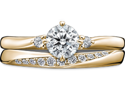 “ピンクレーベル コレクション”は、華やかさ、初々しさをモチーフにしたコレクションです。リング部分にピンクゴールドを用いたものを中心にしながら、イエローゴールドのものなども含めたラインナップで、爽やかな女性らしさを演出します。