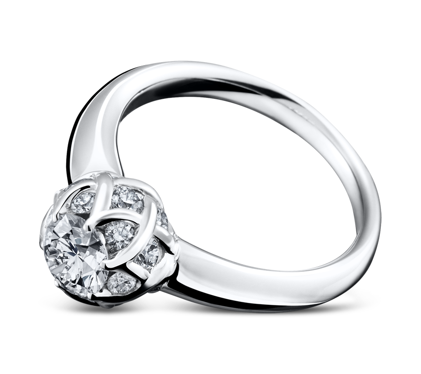 花かごをイメージした、スウィートで気品溢れるリング。センターのダイヤモンドを取り囲むようにプラチナの網目からメレダイヤの輝きがこぼれます。